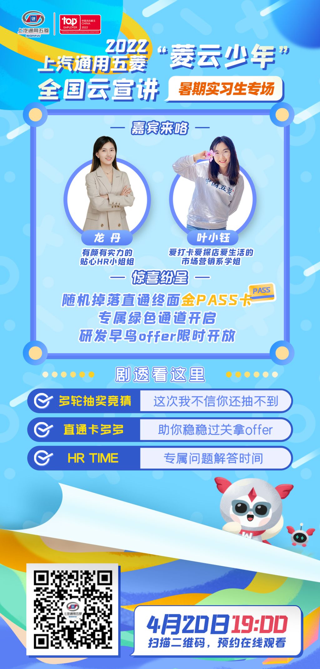 【上汽通用五菱2022暑期实习生云宣讲来袭】连续六年荣膺中国杰出雇主 人民品牌 国潮车企 全方位导师培养 超给力福利补贴暑期实习生云宣讲时间:4月20日 今晚 19:00直播地址:上汽通用五菱招聘视频号绿色通道开启,超多礼品直抽直通终面金pass卡送出!简历投递入口移动端:微信搜索【上汽通用五菱招聘】,点击校园招聘-实习生招聘PC端://zhaopin.sgmw.com.cn