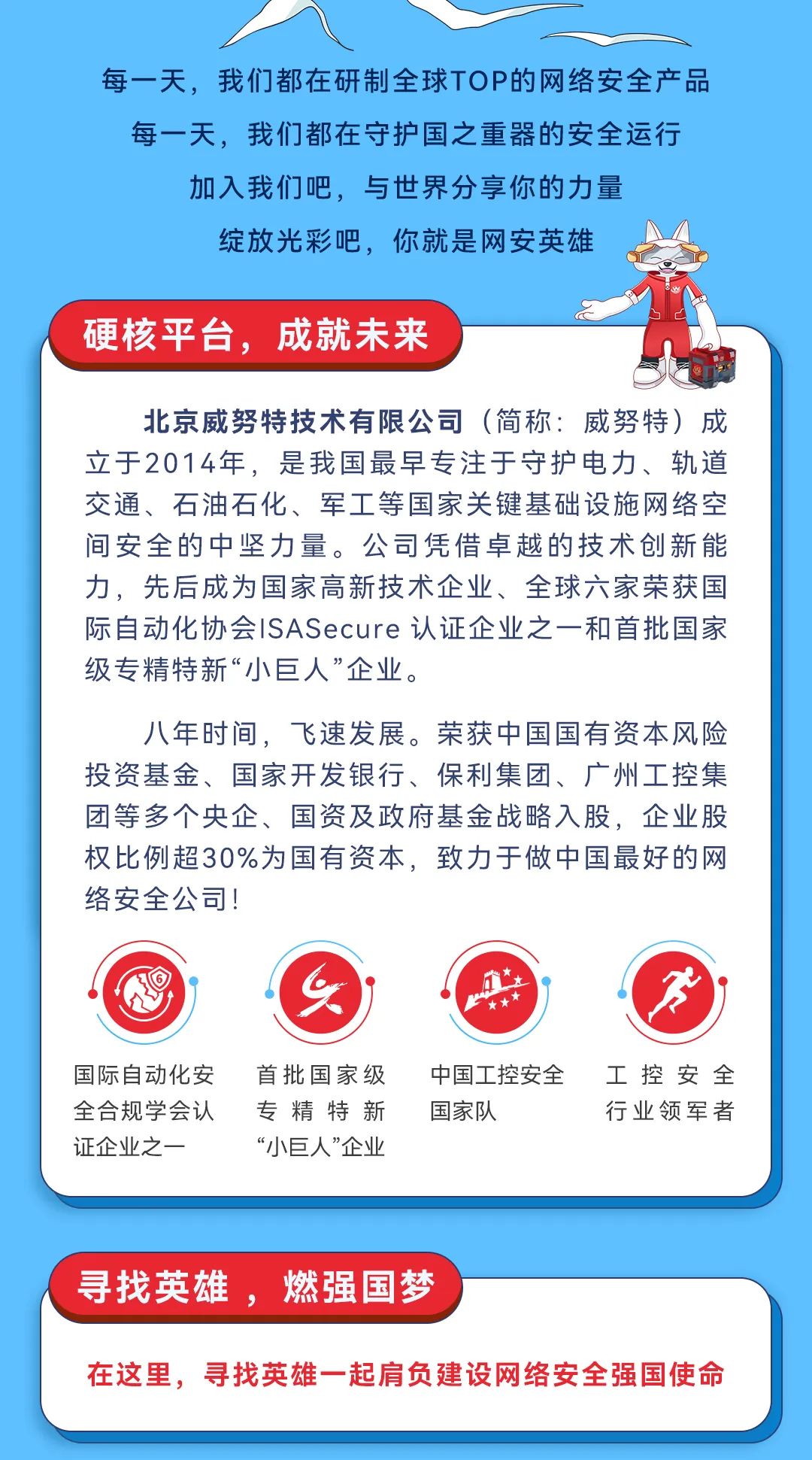 2023届校园招聘,我们将推进“威努特青年菁英人才计划”,寻找网络安全领域的菁英人才,共同为国家工控安全建设奋战,做建设网络强国的领跑者!