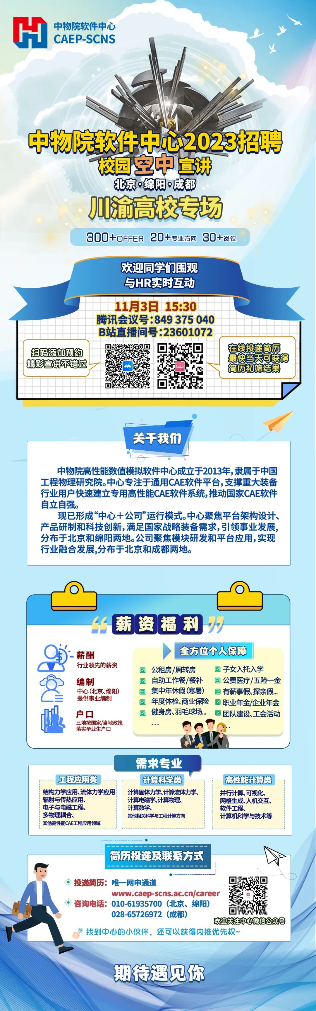 现已形成“中心+公司”的运行模式,北京、绵阳、成都三地面向硕博研究生应届生发放300+OFFER,提供具有竞争力薪资、当地户口/事编、公租房/周转房、职业年金/企业年金、公费医疗/六险一金、集中年休假(寒+暑)、探亲假等福利