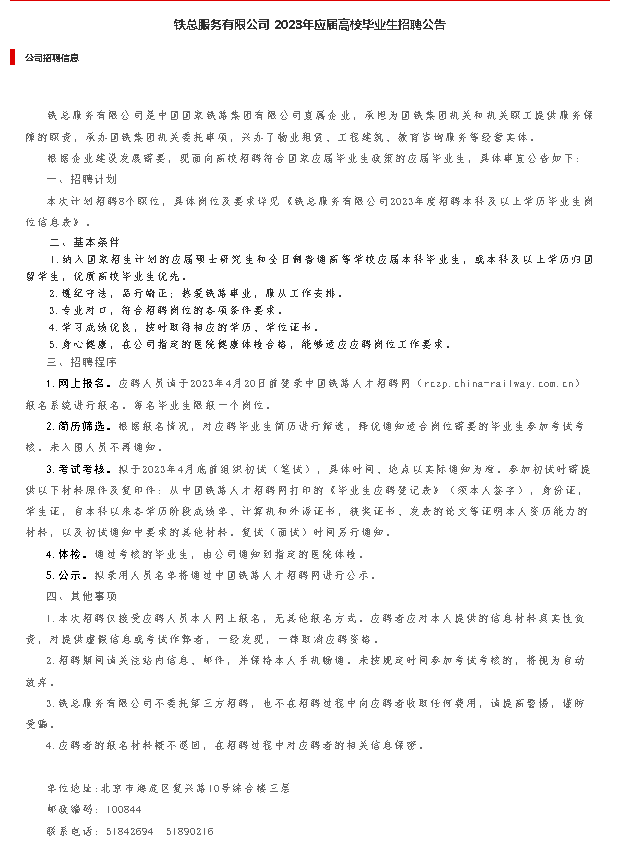 铁总服务有限公司2023届校园招聘(中国铁路)