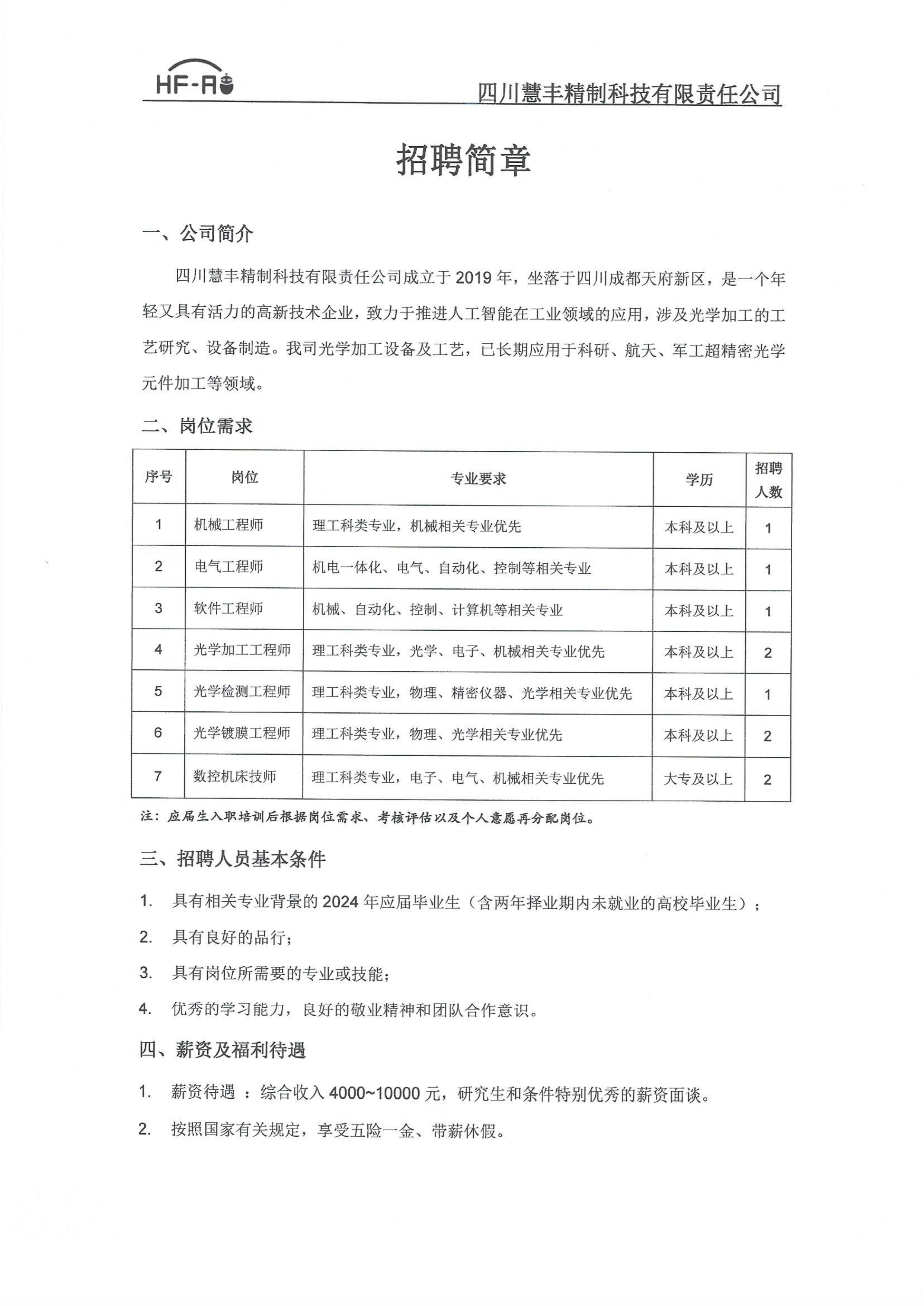 四川慧丰精制科技有限责任公司招聘