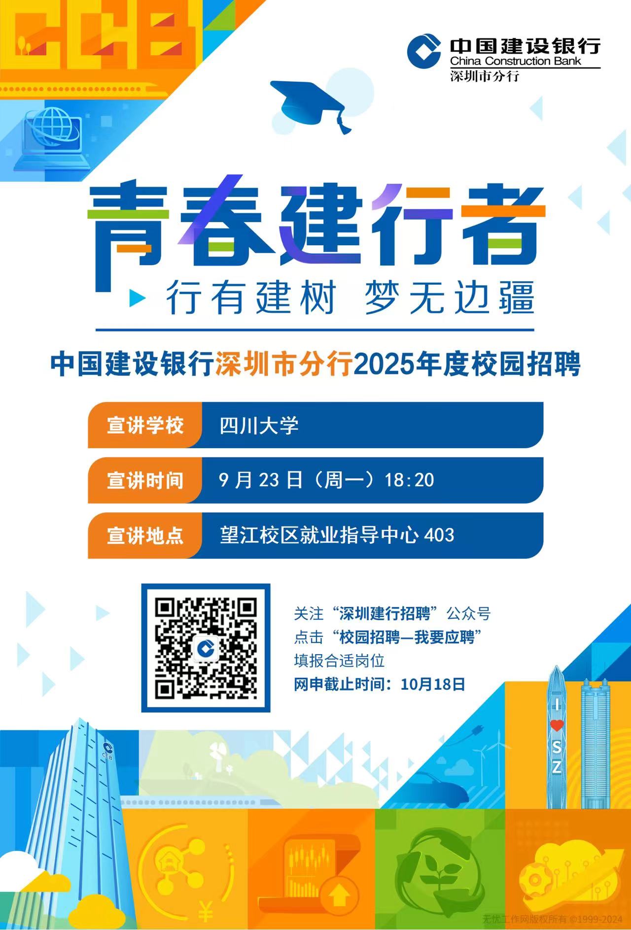 (望江校区)就业指导403举办【建行深圳2025校园招聘】宣讲会的工作人员,下附宣讲会的宣传文案及海报内容,希望您能够协助宣传并转发给学生们,谢谢!