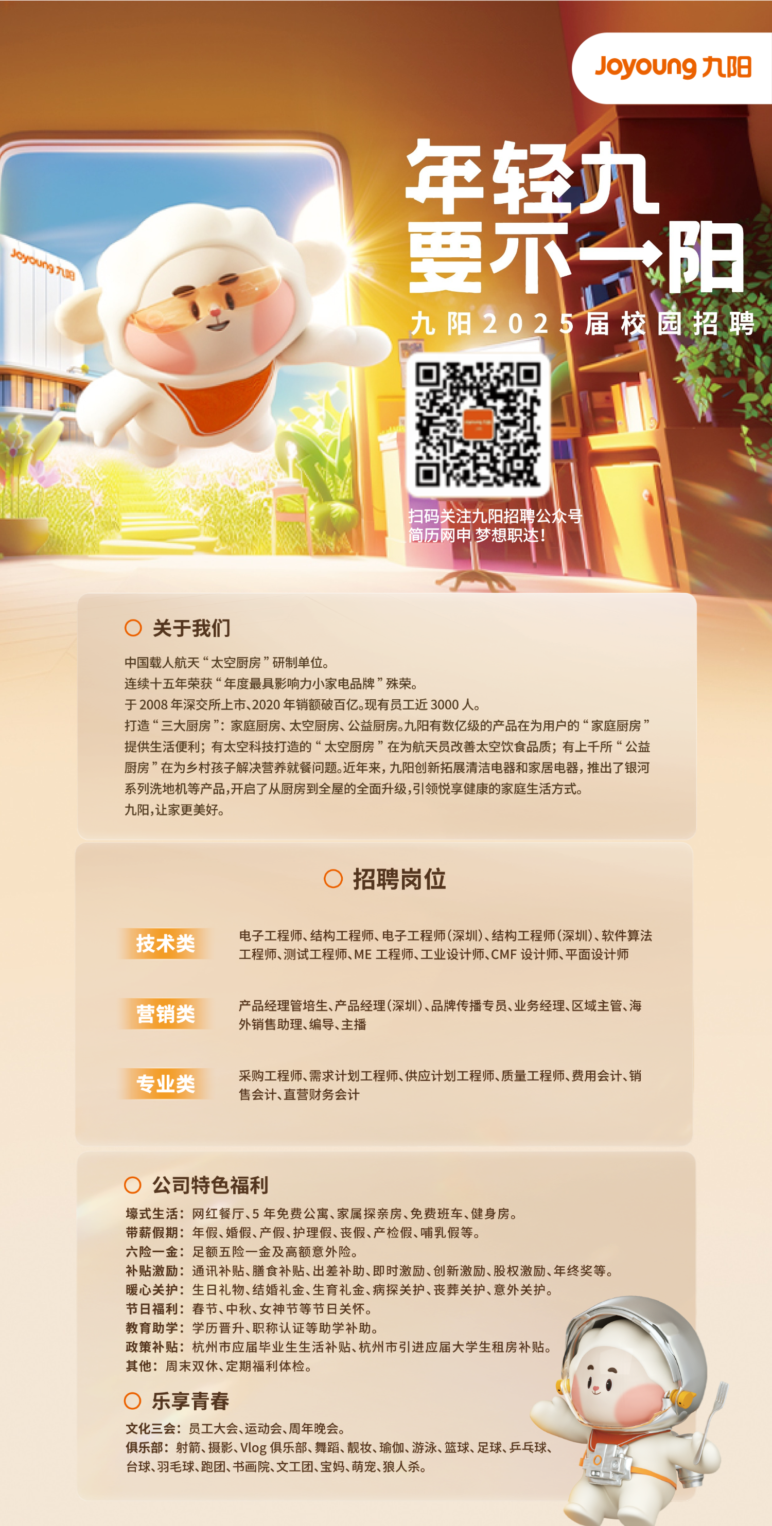 👉 网申地址:PC 端://zhaopin.joyoung.com;手机端:关注微信公众号【九阳招聘】-【校园招聘】-【网申投递】。