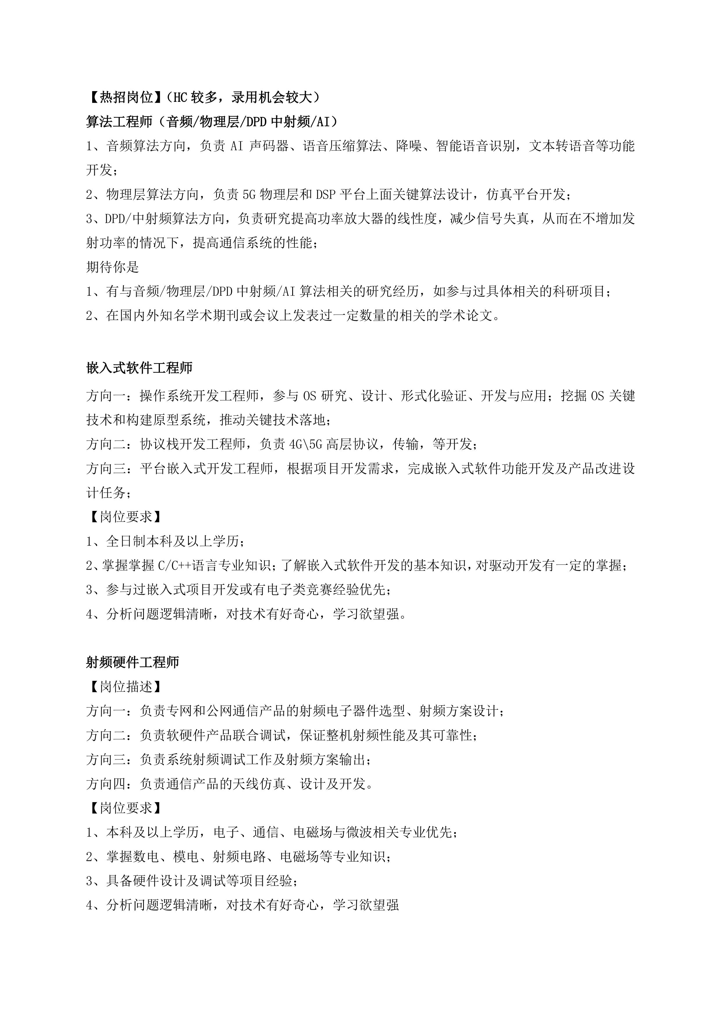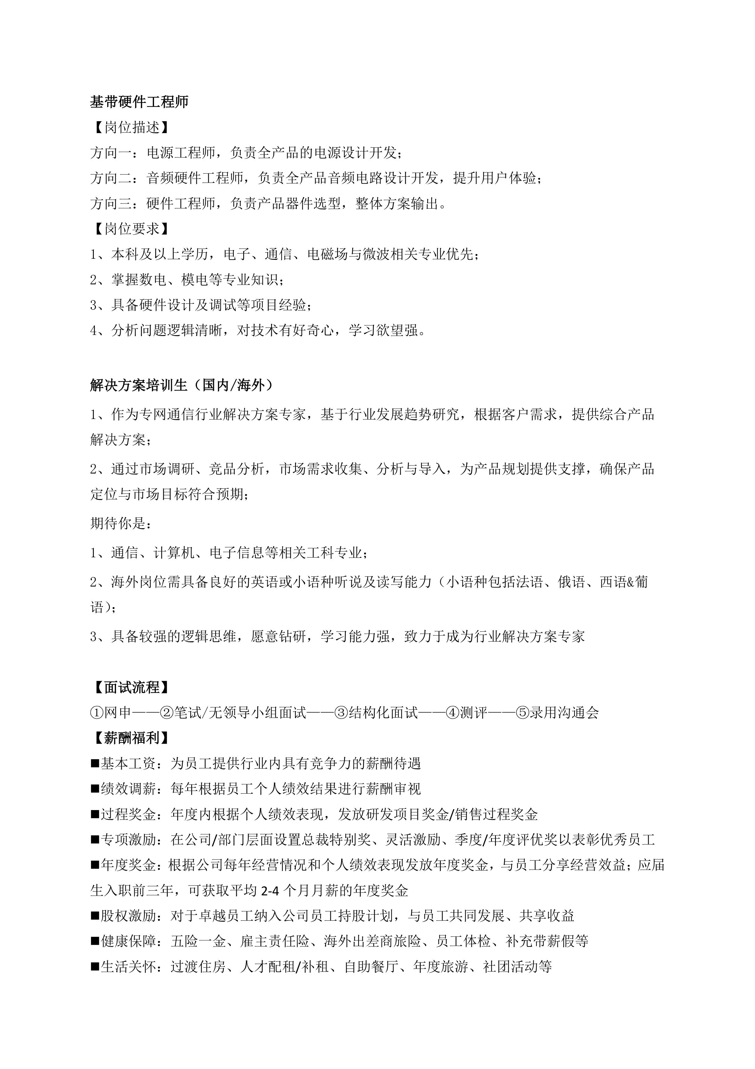 • 热推岗位:射频硬件工程师、算法工程师、产品经理培训生、解决方案培训生(海外)、销售经理(国内/海外)