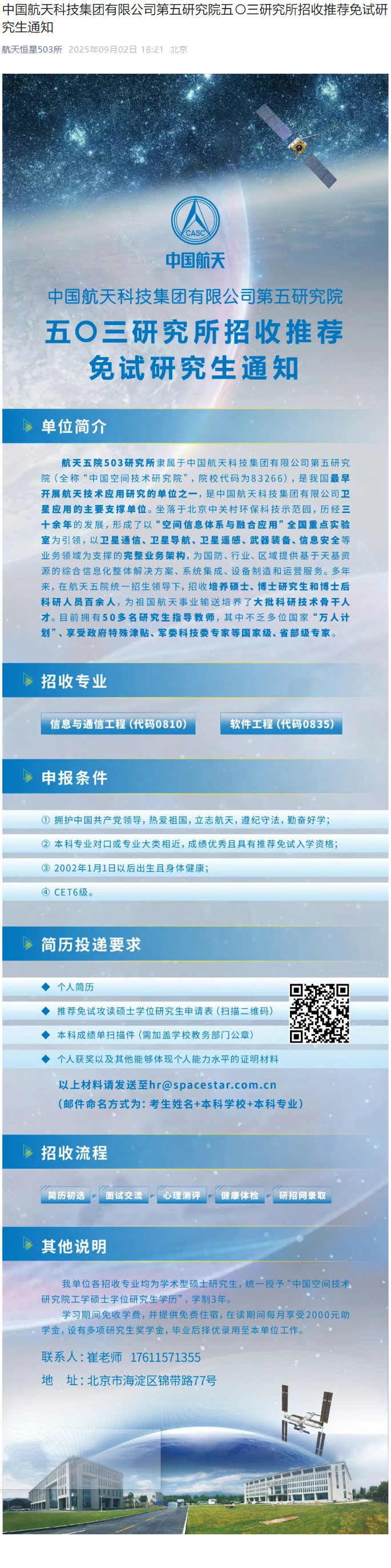 中国航天科技集团第五研究院503研究所招收推免研究生