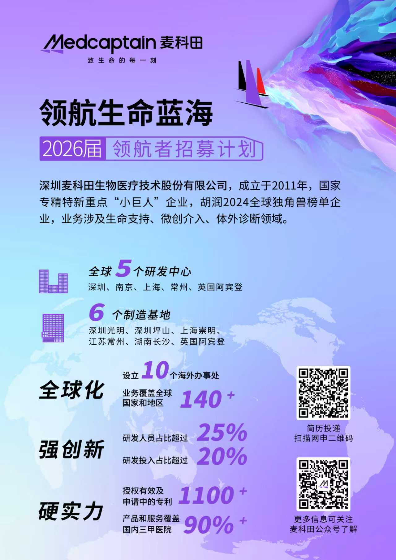 深圳麦科田生物医疗技术股份有限公司,成立于2011年,全球员工超2000人,是国家专精特新重点“小巨人”企业,国家知识产权优势企业、广东省制造业单项冠军示范企业、胡润2024全球独角兽榜单企业,业务涉及生命支持、微创介入、体外诊断领域。