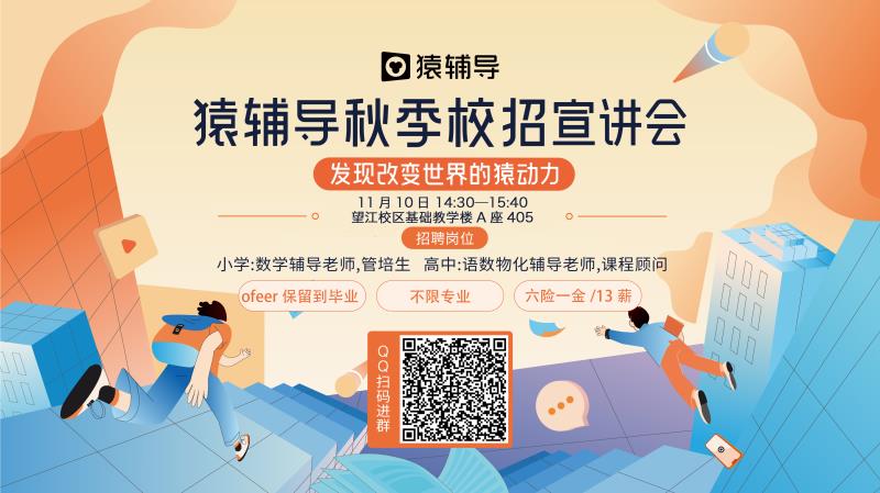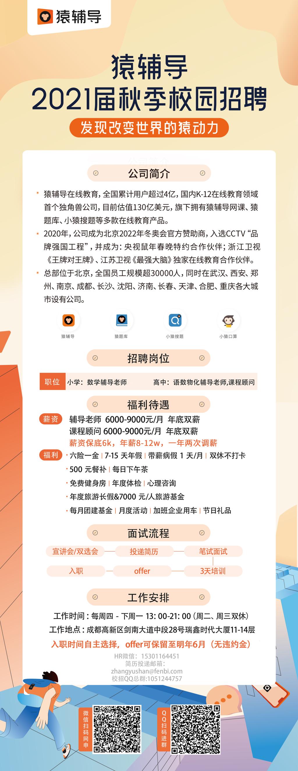 【猿辅导21届秋招18XXX 站】CCTV强国品牌,《最强大脑》合作伙伴,平台大,薪资够,福利多!【薪资福利】️上午不上班,弹性不打卡️每日下午茶,免费健身房️年度出国游,每年7000元旅游基金️入职标配新电脑、新iPad、新手机️每月双休+带薪假,全年7-15天年假【平台】CCTV强国品牌,估值超过155亿的独角兽企业,年轻化,扁平化的互联网氛围(员工平均年龄23岁)。宣讲现场抽奖,礼盒送不停!所有到场同学都送小猿伴手礼一份哦!