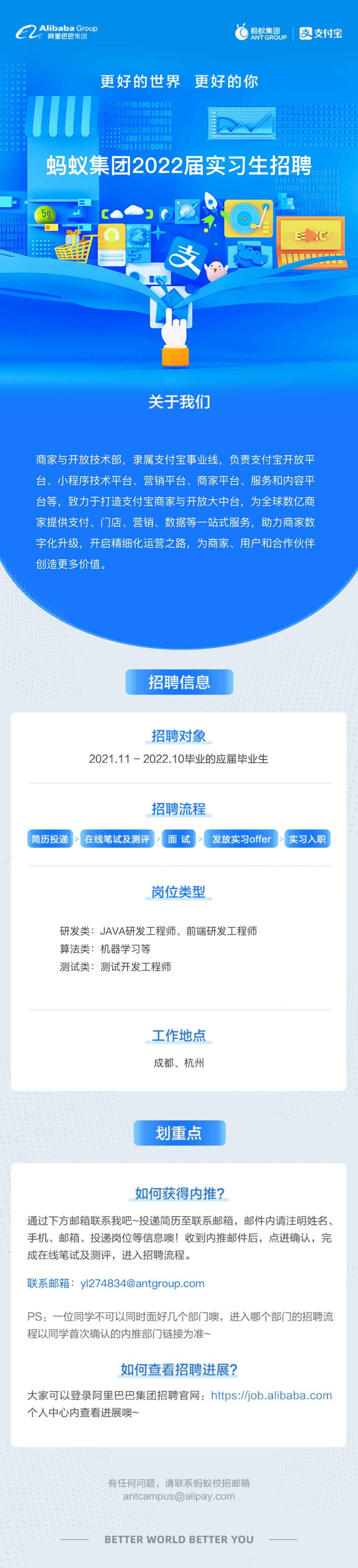 我们团队在做什么?聚焦在蚂蚁集团支付板块,超过10亿的用户及支付数据在我们平台流转,你能感知到支付产品都是我们的业务范围。 你将有机会 * 将你的决策分析直接影响高层决策 * 通过支付数字化深入了解什么是数字化 * 通过机会洞察与AB实验了解数据科学与工程结合 ...... 这里将是你深入支付领域的最快职业通道,欢迎加入我们 [email protected]