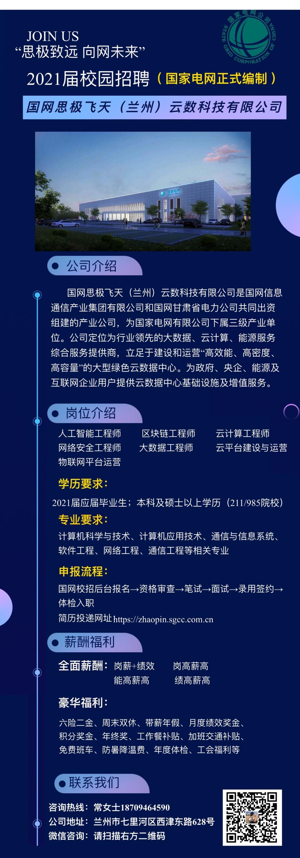 国网思极飞天(兰州)云数科技有限公司(简称:思极飞天)于 2018 年 12月在兰州新区注册成立,公司现有注册资本 9800 万元,是国网信息通信产业集团有限公司和国网甘肃省电力公司共同出资组建的产业公司,为国家电网有限公司下属三级产业单位。