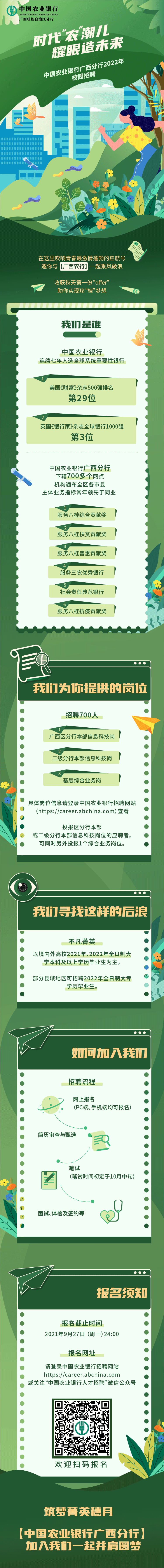 【时代“农”潮儿,耀眼造未来】—中国农业银行广西分行2022年校园招聘正式启动!大型国企广阔的发展平台完善的激励培养体系【招聘需求】700人(信息科技岗、综合业务岗)【报名网申】//career.abchina.com/buildMobile/index.html#/OrgPositionList/99/1619,249,-1【报名截止时间】2021年9月27日(周一)24:00中国农业银行广西分行加入我们一起并肩圆梦