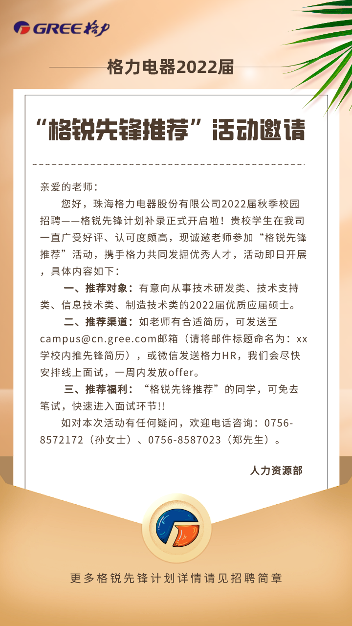 目前格力电器先锋计划补录仍在继续,现诚邀老师参加“格锐先锋推荐”活动贵校暂未签约或暂无心仪offer的2022届硕士同学,如对格力有意向,可直接将其简历发送微信或[email protected]邮箱我们会尽快安排其线上面试、免去笔试环节并于一周内发放offer!!!