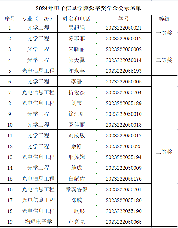 根据《关于评选2024年舜宇奖学金的通知》相关要求,通过学生自愿书面申请并提供相关材料,18XXX 集体评审。现予以公示,名单如下。