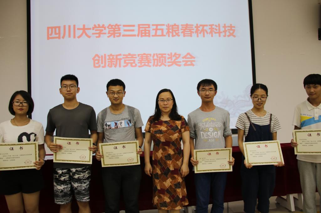 学子提供了这样一个展示自我,提升实践创新能力的平台,表扬了在此次比赛中获奖的同学,肯定了同学在比赛中做出的努力。她希望可以有更多同学能参与到“五粮春杯”等一系列的比赛中来,在比赛锻炼自己,在比赛中突破自己,成为社会中的精英人才。最后,冯国英院长为获奖同学颁奖,并和他们合影留念,18XXX