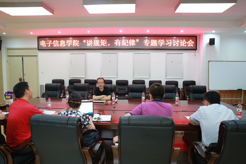 2016年7月1日下午,18XXX “讲规矩、有纪律”专题讨论会在基础教学楼A303会议室举行。副校长晏世经、全体院领导参加了会议。学习讨论会由院党委书记蒋斌主持。