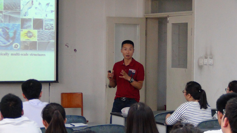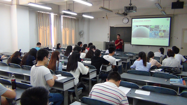 的工作经验,介绍了利用飞秒级设备制造纳米微米结构的科学研究,李教授结合大自然与已有的科学知识,将蝴蝶翅膀、荷叶、昆虫复眼等生物独有的特性应用到激光微纳中,得出了一些具有重大意义的成果,同时李教授展望了该项研究的工程应用和环保应用。陈烽教授对于老师和同学们提出的问题,进行了详细的解答。最后,由18XXX
