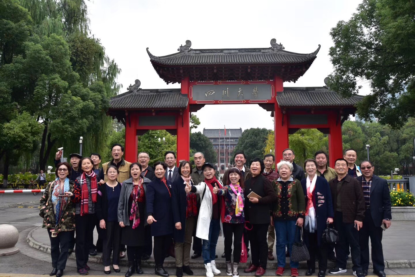 的专业分布,之后一路为校友介绍望江校区如今的建筑和人文风光,随着时间的推移,如今的望江校区与当初的校园有着翻天覆地的变化,校友们一边回忆当初自己在校时的场景,一边感慨学校的变化之大。身处在大学校园中,这些年过半百的校友仿佛又回到了当年的青葱岁月。在校友们热烈的讨论中,专车很快开到了如今的川大正门——北门。众人下车合影留念,这些久别重逢的老同学终于再一次回到了大家一起度过四年时光的地方。
